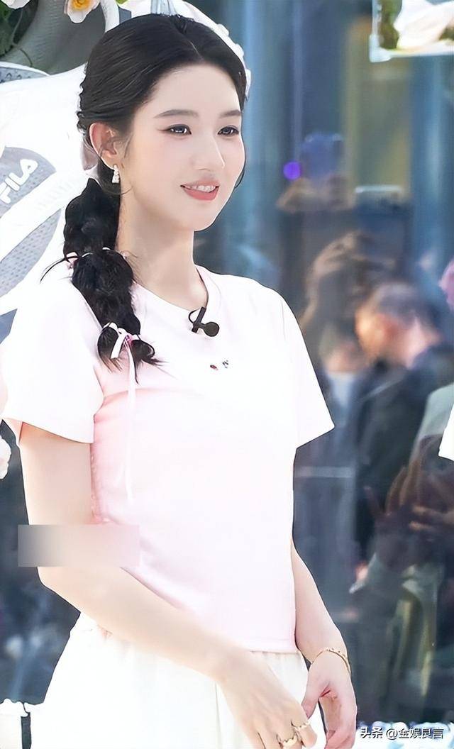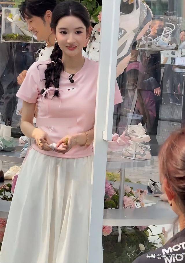 当天北京的天气不算炎热,但阳光充足,王玉雯穿了一件浅粉色的短款上衣,搭配一条白色百褶半身裙,头发随意地扎成侧马尾,软乎乎的配色看着十分减龄。