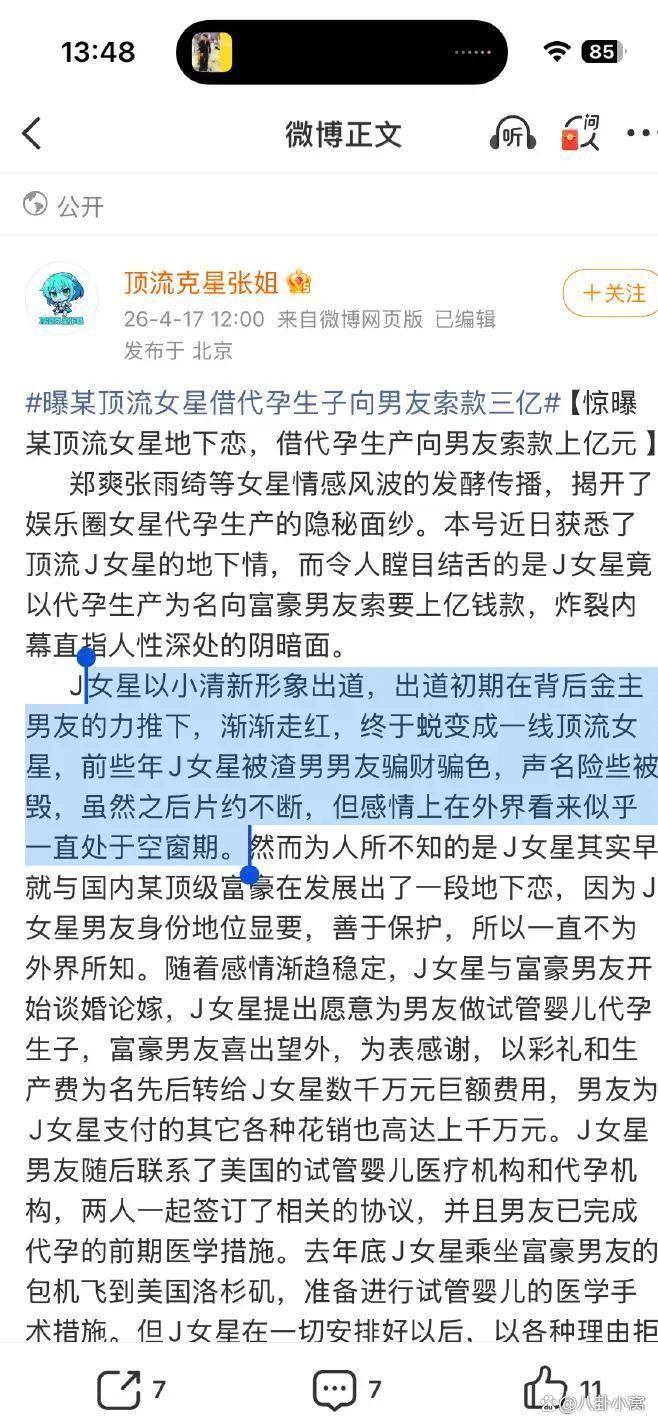 娱乐圈瓜田从不缺新剧情。近日,一则"顶流女星借代孕索要3亿"的爆料突然刷屏——匿名博主"顶流克星张姐"抛出一串模糊标签:"小清新出道""曾被渣男骗财骗色""感情空