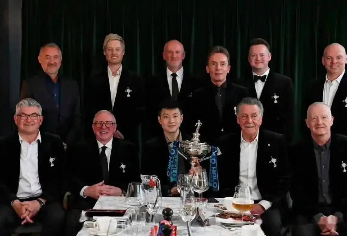 这份“众星捧月”的温情,既是对赵心童赛场硬实力的极致肯定,也是斯诺克大家庭惺惺相惜的传承体现。而在另一场汇聚了亨德利(7冠王)、戴维斯(6冠王)等上古神兽级别的“冠军晚宴”合影中,赵心童同样稳居核心,手捧奖杯与大佬们同框,彻底宣告了“赵心童时代”的到来。