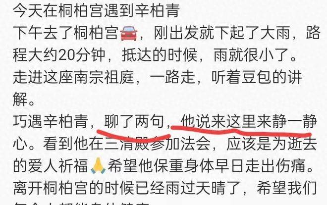 这已经不是辛柏青第一次出来祈福了。之前就有网友碰到他和好友李乃文一起前往大孤山祈福。对辛柏青来说,找一个安静、山清水秀的地方,静静地待一会儿,给已故的爱人说说话,可能比什么都能让他心安。此次来到天台山,他并非孤单一人,只是安静地跟着流程走,完全没有任何摆拍、炒作的成分,单纯是为了给自己一个放松和宣泄的机会。52岁的人,生活依旧朴素低调,没事就和三五好友出去走走逛逛,完全没有明星的浮华与张扬。他不过是一个失去了爱人的普通人,寻找一个地方来安放自己深藏的思念罢了。
