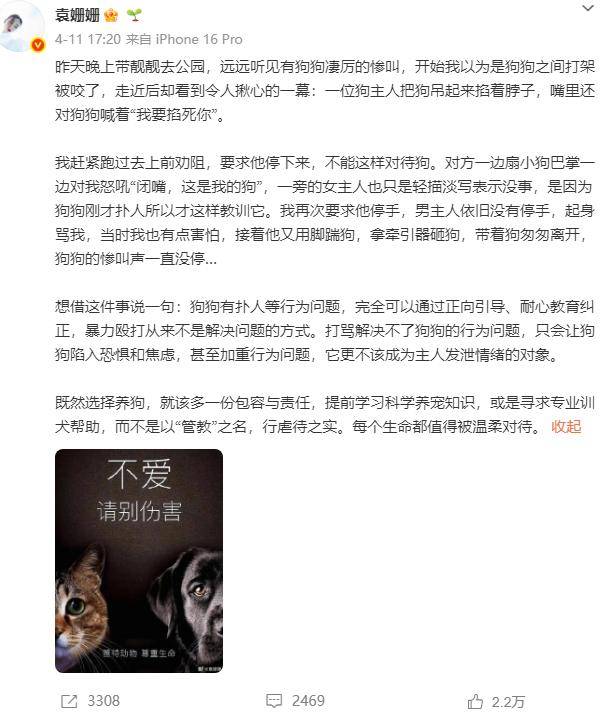 袁姗姗也特意强调,如果宠物有行为问题,完全可以通过正向引导去纠正,暴力从来都不是解决问题的方式,宠物更不应该成为主人发泄情绪的对象。最后她还附上了一张 “不爱,请别伤害” 的公益海报。