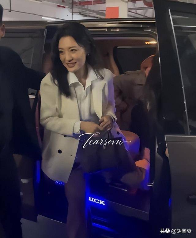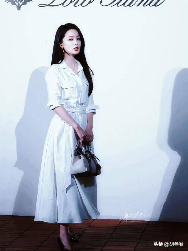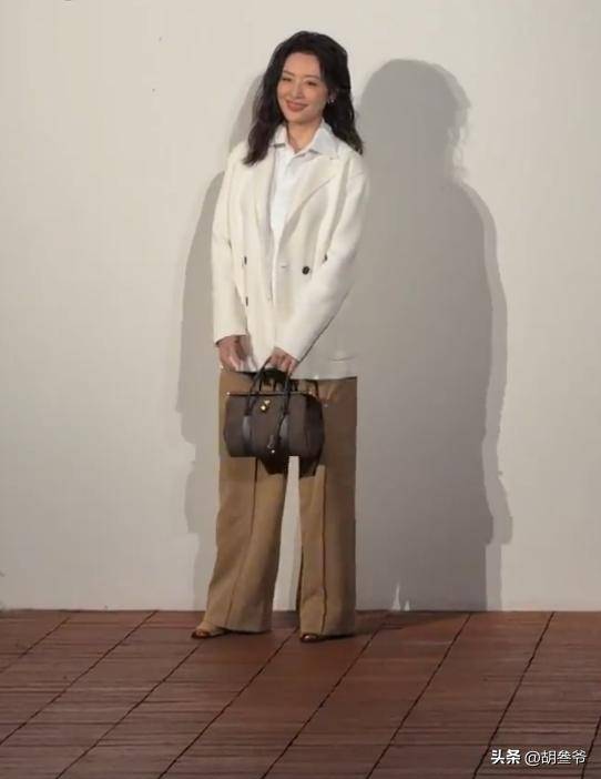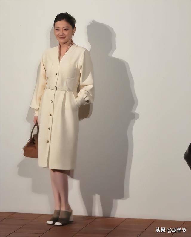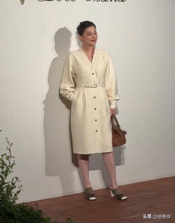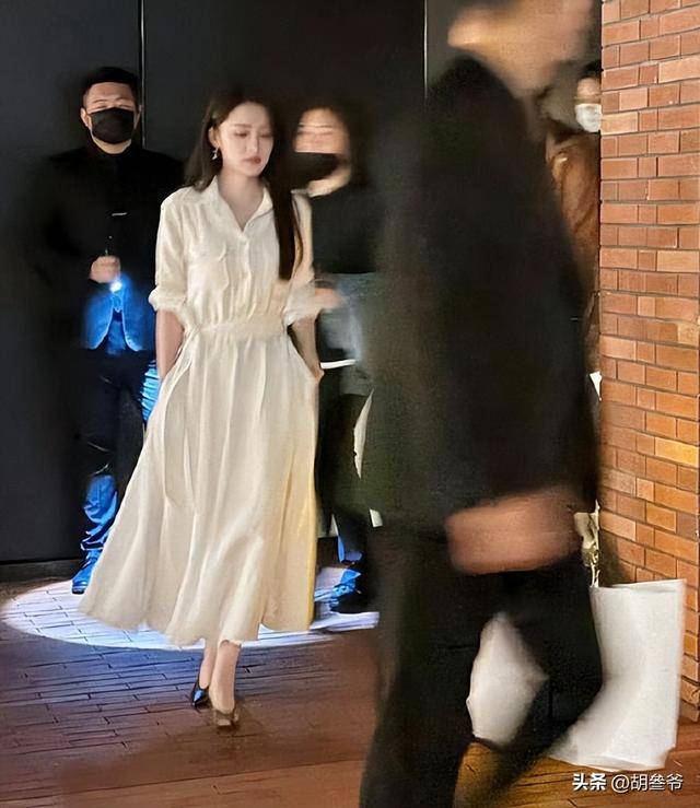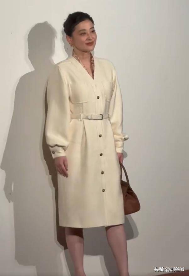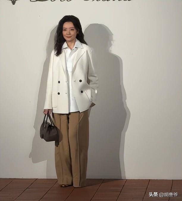 当天梅婷穿一件白色西装针织连衣裙,长袖设计温柔又遮肉。