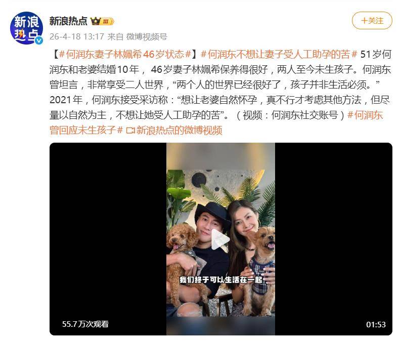 据4月18日报道,最近,51岁的何润东与46岁妻子林姵希结婚十年的状态,又悄然成了话题焦点。这对夫妻不仅感情十年如一日,更因坚持“丁克”选择,以及何润东那句“不想让她受人工助孕的苦”的宠妻宣言,引发了一波关于婚姻与生育的讨论。