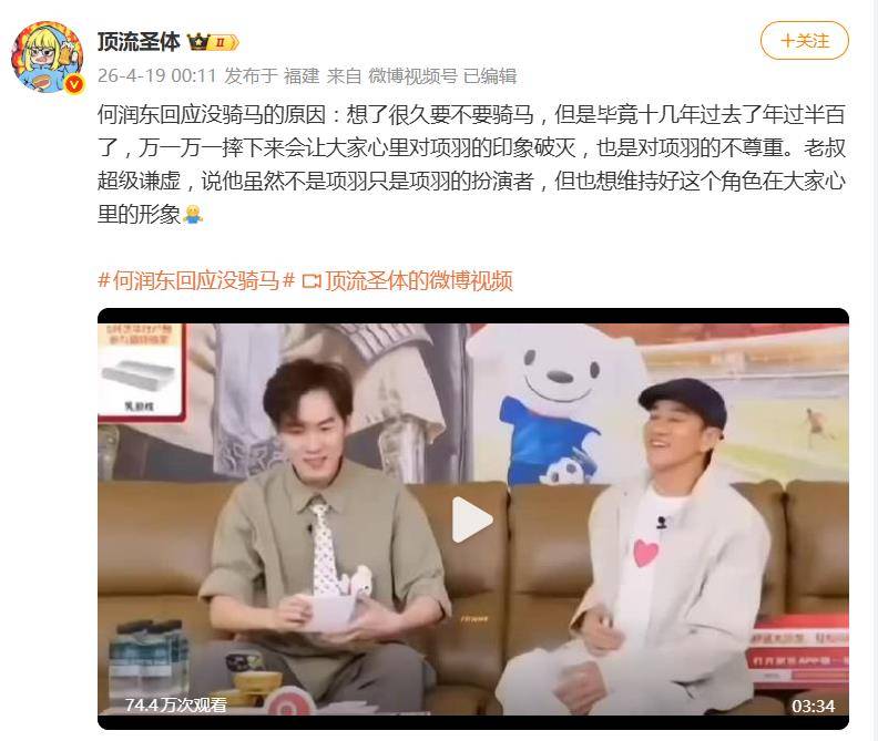 这份“有把握”,更深层的动力来源于对角色近乎神圣的敬畏。何润东强调,自己虽然只是项羽的扮演者,却肩负着维护这个英雄角色在公众心中形象的责任。“我想了很久要不要骑马,”他说,“万一摔下来,会让大家心里对项羽的印象破灭,这也是对项羽的不尊重。”在他眼中,个人的一时风光远不及维护“霸王”在观众心中崇高感的万分之一重要。这份清醒,让网友直呼“挺真诚的,他看重的不是自己,而是项羽的形象”。