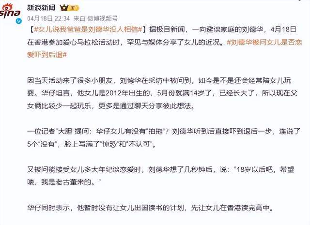 被问“女儿有没有拍拖”,让见惯大场面的刘德华瞬间后退一步,连说五个“没有”,脸上写满“惊恐”——这一幕发生在香港爱心马拉松活动现场,却精准戳中了天下父亲的共同软肋。4月18日,刘德华在分享女儿近况时坦言,2012年出生、即将满14岁的女儿已长大,父女间玩乐减少,更多是聊天交流。但当敏感问题突袭,那位在台上光芒万丈的“华仔”,瞬间切换为最普通的“护崽老爸”。当再被问及能接受女儿多大谈恋爱时,他思考几秒后给出的答案是“18岁以后吧,希望喽,我是老古董来的”。同时,他也表示暂无让女儿出国读书的计划,先让她在香港完成高中学业。