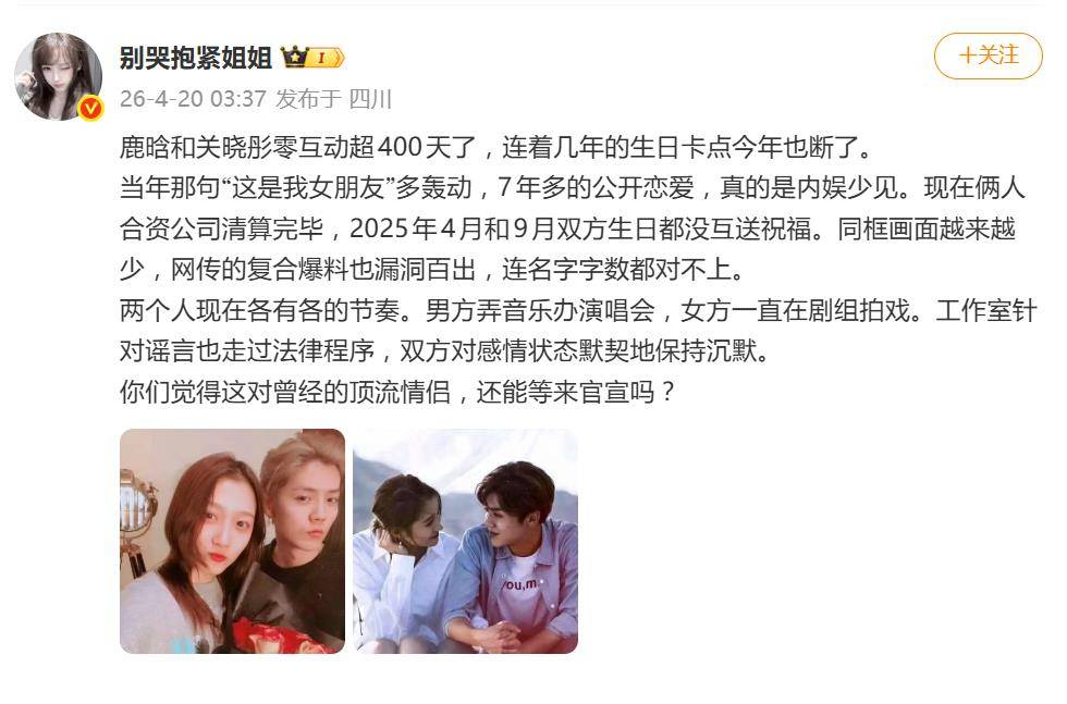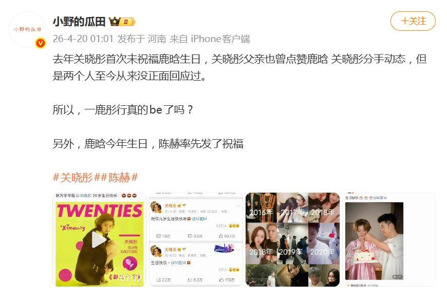部分网友认为,这已是“分手”的明确信号。他们的依据不止是庆生惯例的连续中断,还包括关晓彤父亲曾点赞分手相关动态的“手滑”事件,以及双方近年来公开互动肉眼可见地减少。更有细心的网友统计出,两人最后一次公开同框还要追溯到2024年8月,而自2024年11月鹿晗秒删一条为关晓彤新剧宣传的博文后,双方再无任何直接关联的动态,社交平台零互动已超过400天。