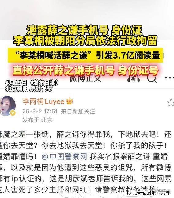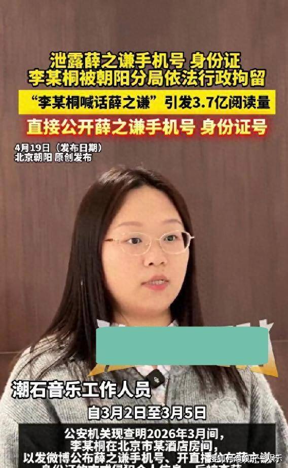 2026年4月19日下午,北京广播电视台《法治进行时》栏目曝出消息。李雨桐因泄露薛之谦手机号和身份证号,被北京朝阳警方依法行政拘留十日。拘留日期从2026年4月10日开始,到4月20