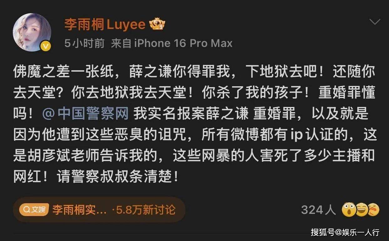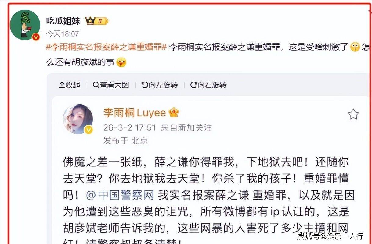 2026年3月2日晚上,李雨桐在微博发布了实名举报。她指控薛之谦涉嫌重婚罪,并提到自己因他导致堕胎,长期遭受网络暴力。这条微博迅速登上热搜。