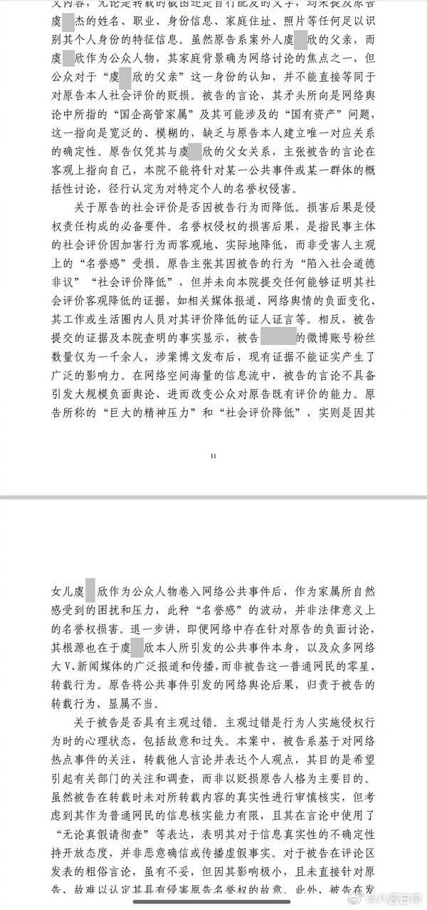 法院认为虞书欣父亲因家族财富、高利贷等争议被大量议论,已经形成公众事件。社会评价变化的原因更可能来自事件本身,而不是某个具体讨论者,难以和被告形成直接因果链。