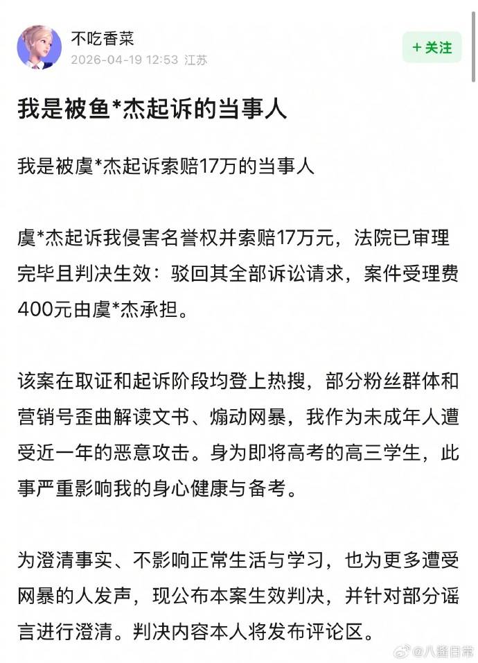 她公开判决书想澄清,顺手也把另一件事点出来:对造谣者取证,准备起诉。