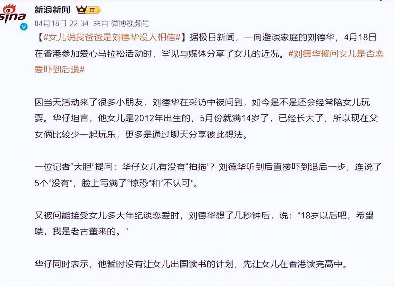 刘德华倒是很坦诚,说女儿2012年出生,马上14岁了,父女俩不像小时候那样玩闹了,更多是聊天,互相讲讲学校的事、家里的事。