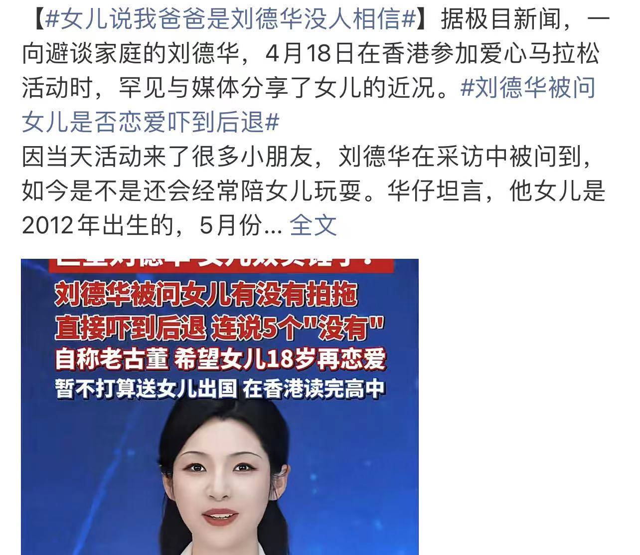 其实细想,他这反应也不奇怪。他女儿今年14岁,5月份就满14了。刘德华51岁才当上爹,对这个闺女,那是把心都掏出来宠。以前为了保护女儿隐私,恨不得把她藏在保险箱里,现在被问这么敏感的问题,不炸毛才怪。