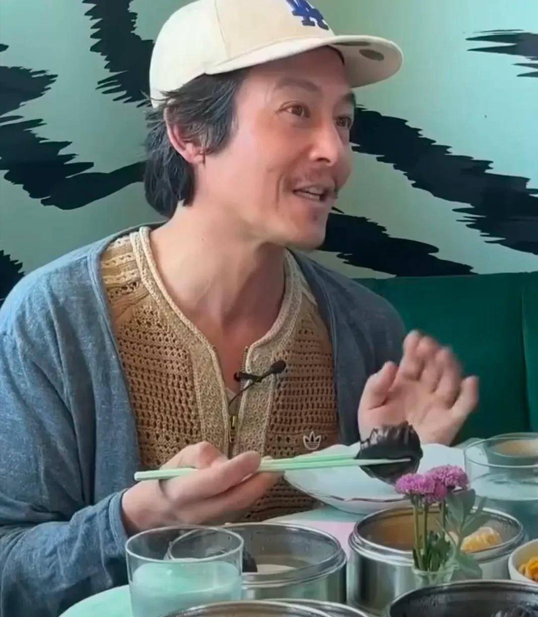 当年那个因为一个角色就能掀起模仿热潮的偶像,如今穿着联名款坐在餐厅里,胡子花白,皱纹深刻。 镜头捕捉到他大笑的瞬间,眼角的纹路挤在一起,没有遮掩。