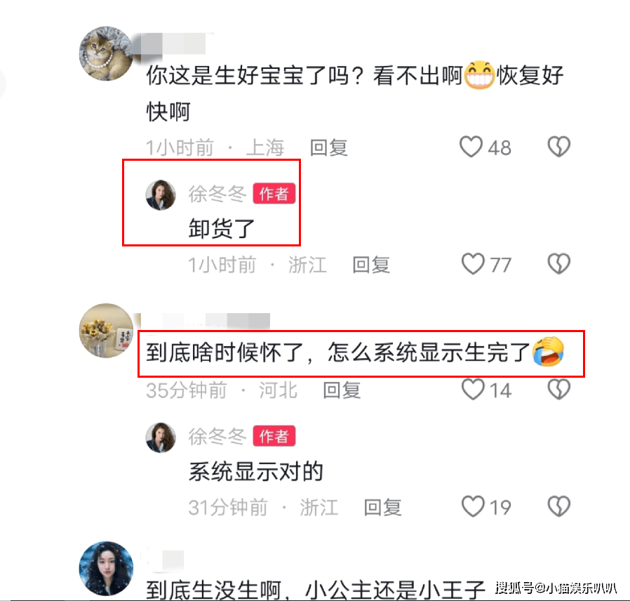 4月17日,徐冬冬在视频下回应网友:已经卸货生完了。被追问“是有两个小孩吗”,她答:“是的。”
