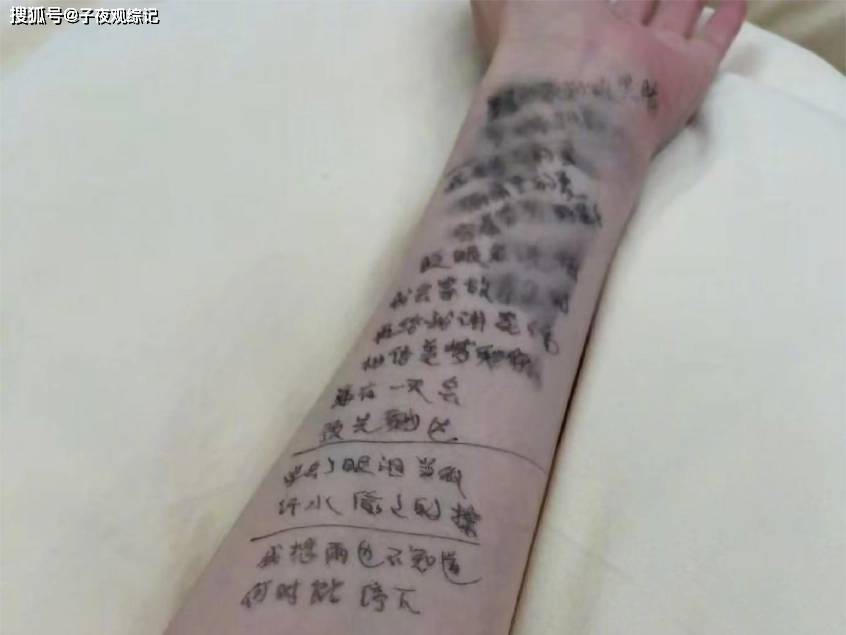 这妹子还真挺大胆,黑色记号笔从手腕一直写到手肘,密密麻麻的跟纹身似的, 队友孙怡当场就看呆了,还问你这胳膊纹身。