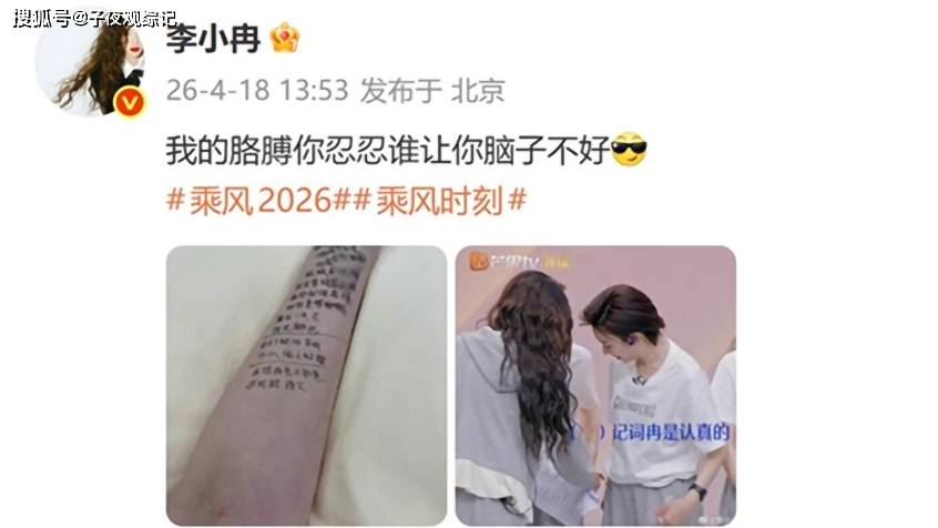 老实说, 第一次看到《乘风2026》二公小考里李小冉把歌词抄满两个胳膊的画面,我差一点就把奶茶喷出来。这妹子还真挺大胆,黑色记号笔从手腕一直写到手肘,密密麻麻的跟纹身似的,