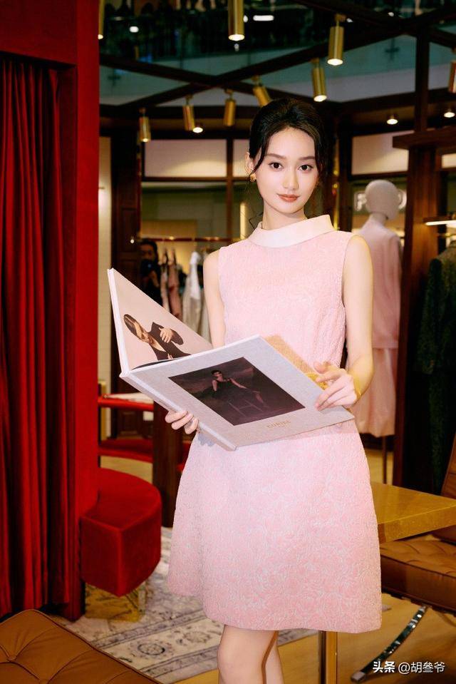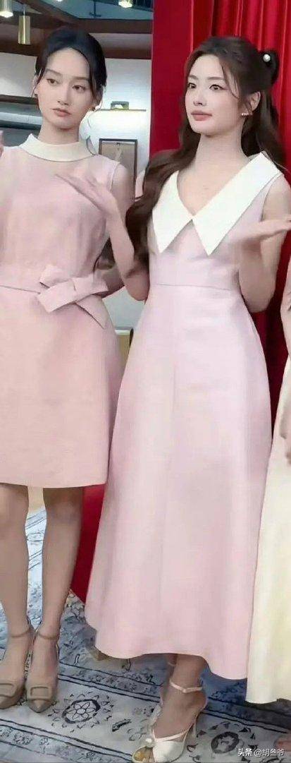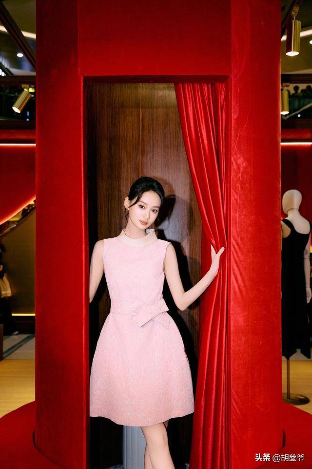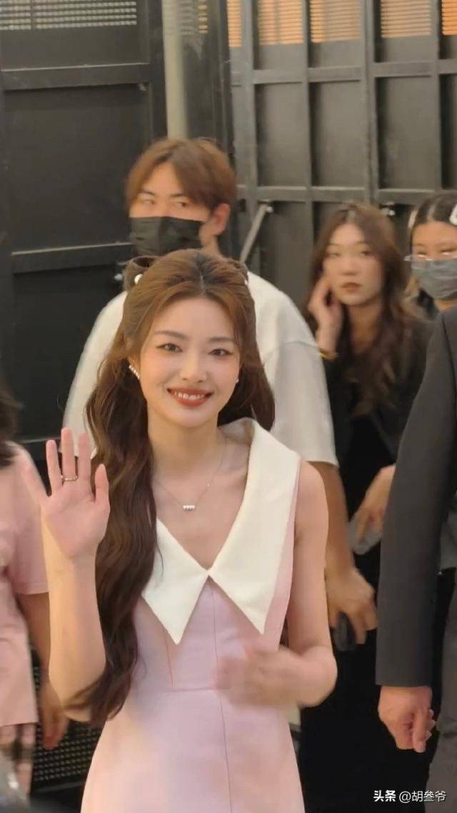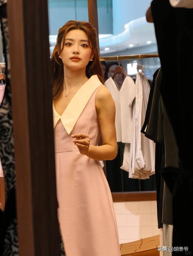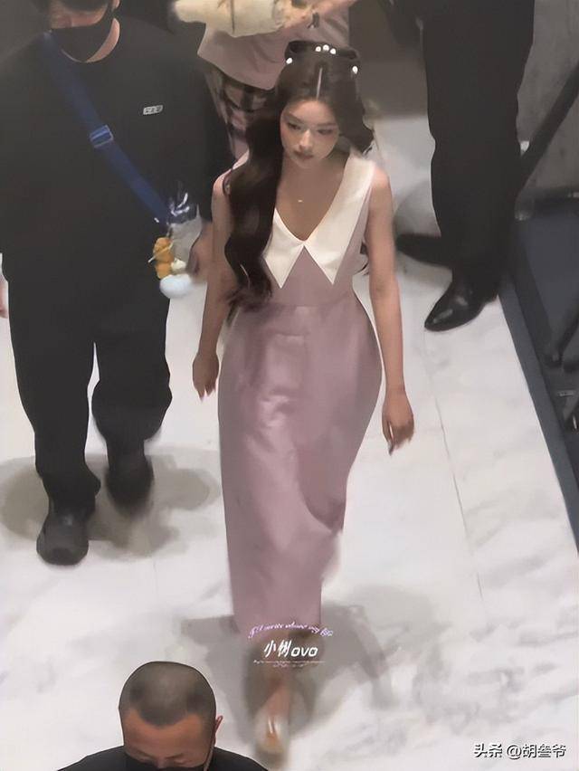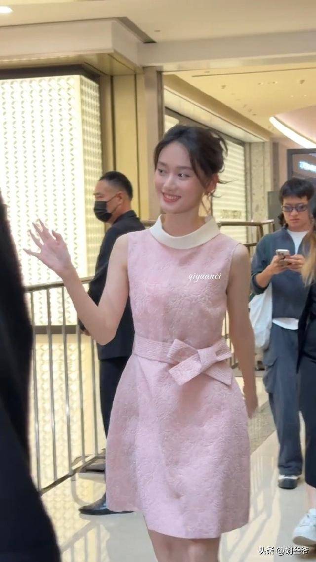 她穿着一身淡粉色小翻领连衣裙,长度刚好在大腿中部,利落短款直接把纤细修长的双腿衬得格外吸睛,没有多余的装饰,全靠版型撑住气质。