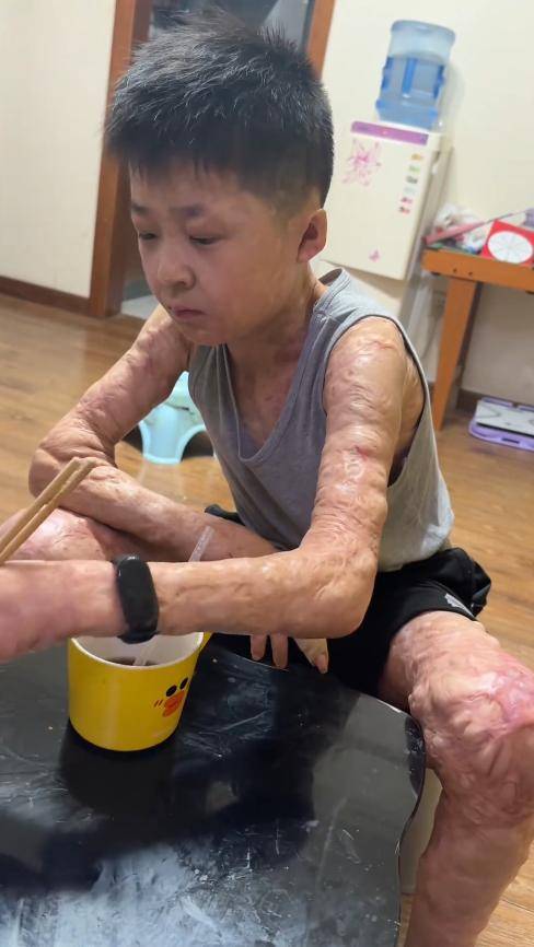 更让人揪心的是,随着身体慢慢发育,僵硬的瘢痕会牵拉着皮肉,每天都在经历撕裂般的生长痛,那种疼,成年人都难以忍受,可轩轩却硬生生扛了下来。