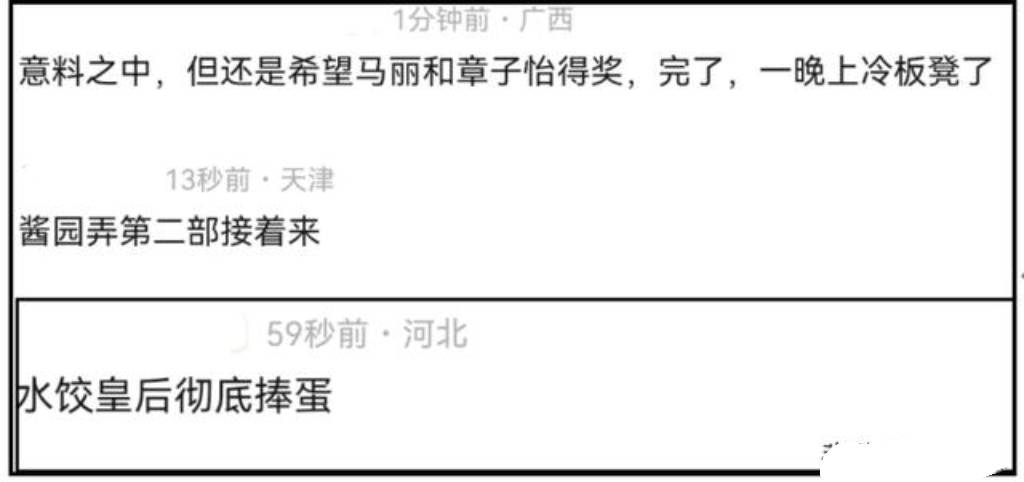 章子怡和马丽这次没有获奖,两个人一直坐在台下,镜头拍到她们好几次,表情显得平静,观众看着却有点心酸。