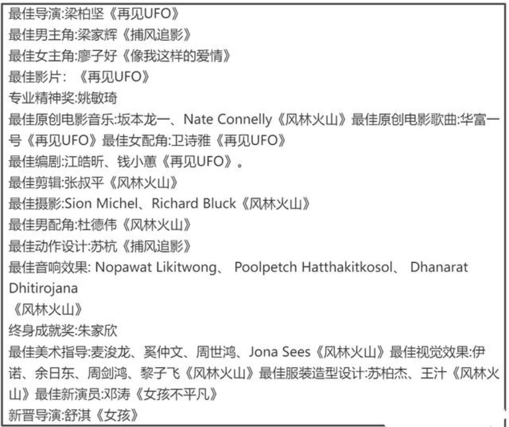 廖子妤第一次提名金像奖就拿到影后,很多人不熟悉她名字,但她的片子《窄路微尘》口碑挺好,。章子怡和马丽这次没有获奖,两个人一直坐在台下,镜头拍到她们好几次,表情显得平静,观众