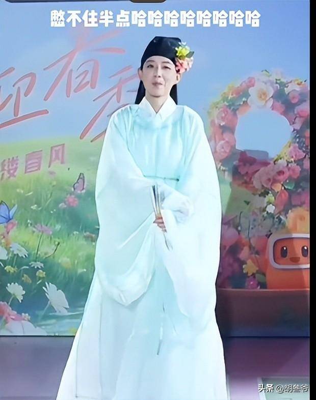 她一身青色古风长袍,反串簪花公子,鬓边别着鲜艳牡丹,造型温润又英气,完美契合今生簪花,来世漂亮的传统寓意。