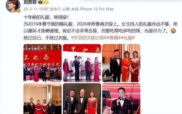 今年2月,2026年美术界的春节晚会,她再次站上主持台,身上那件红色晚礼服,是2016年春晚的时候做的。