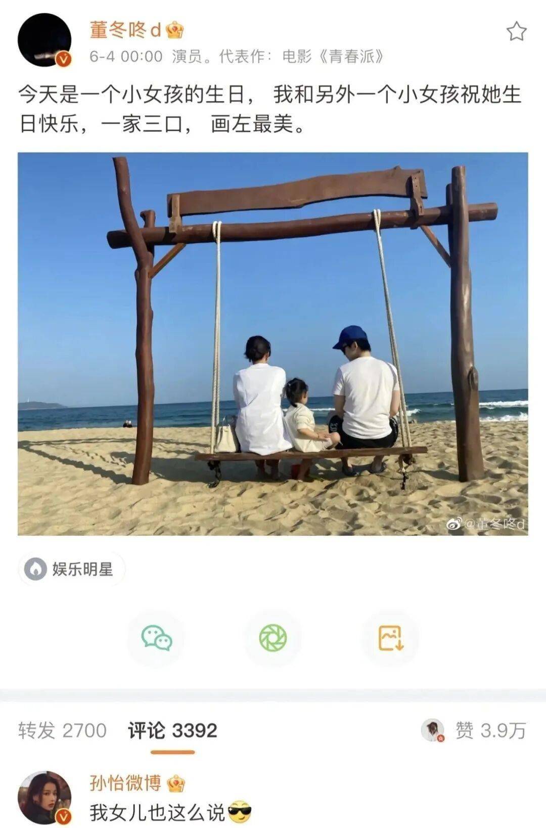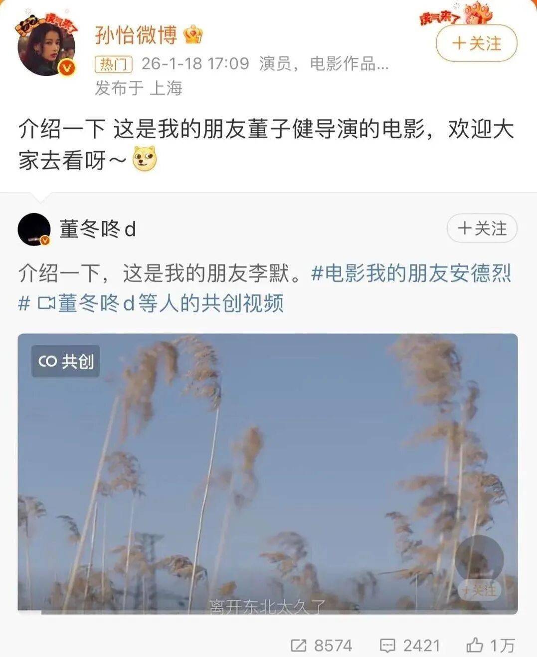 董子健导演的作品《我的朋友安德烈》上映时,孙怡转发说支持我的朋友,真的应了那句歌词“十年之后,我们是朋友,还可以问候”。