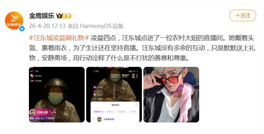 据4月20日报道,凌晨四点,当大多数人都已沉入梦乡,汪东城却悄悄点进了一个普通的抖音直播间。画面里,一位农村大姐头戴头盔、身裹雨衣,仍在为生计坚持直播。他没有说话,没有互动,只