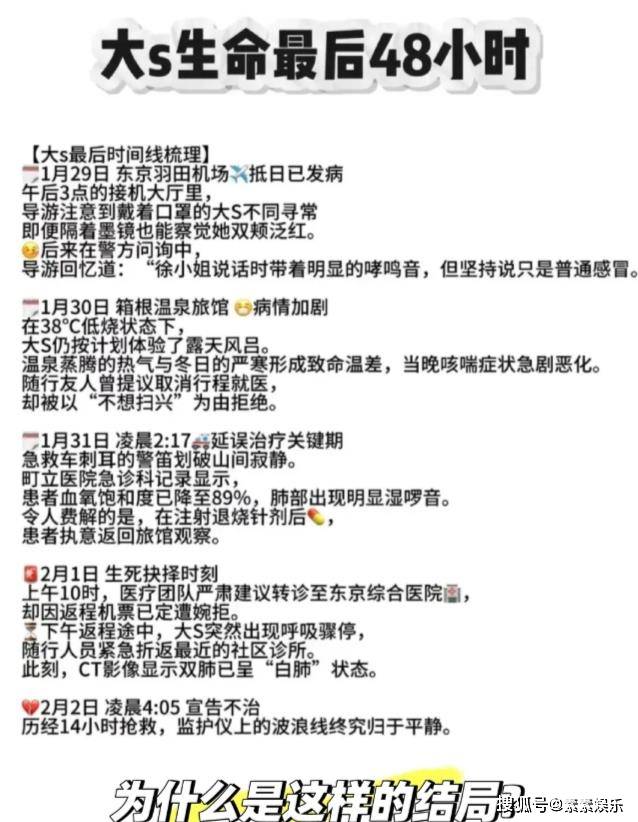 甚至有网友列举了大S离世的整个细节过程,在她生命最后的48小时内,她完全有挽救的机会,但是很可惜,她在2月2号的凌晨4点左右,最终因抢救无效离世。