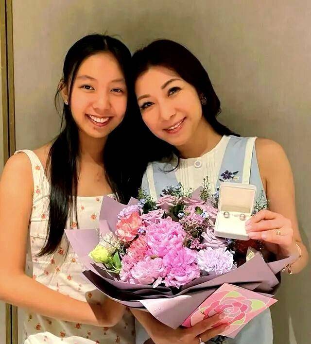 朱凯婷身边的女孩正是她的女儿,小家伙今年已经十四岁了,出落的很标致,她穿着吊带碎花裙,肤色偏小麦色,看起来很健康。