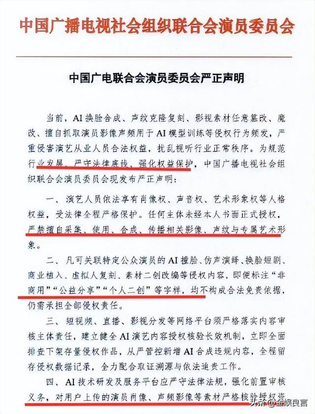 而且之前就有中国广电联合会演员委员会也发了声明,说现在AI换脸、声纹克隆的侵权行为越来越多,严重侵害演员的合法权益,扰乱行业秩序。