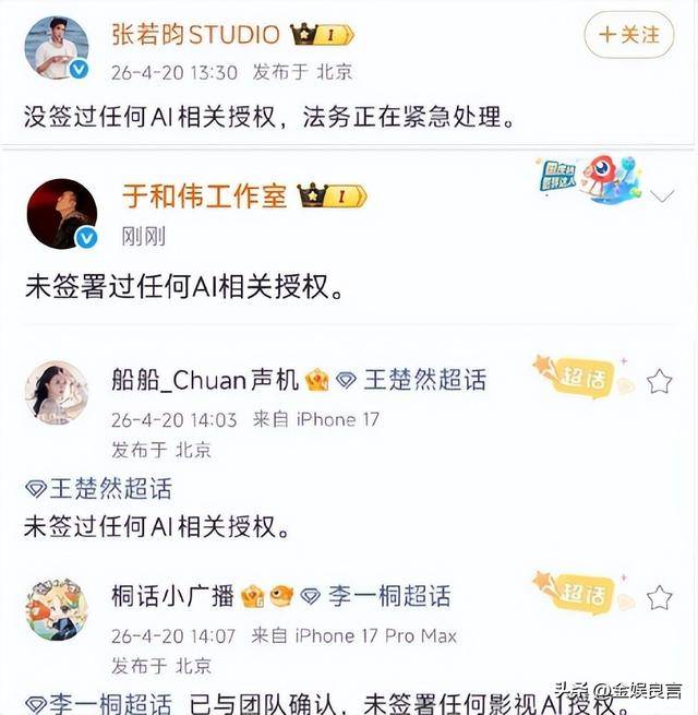 紧跟着,于和伟、李一桐、陈哲远这些艺人的团队也纷纷表态,清一色都是“未签署影视AI授权”。