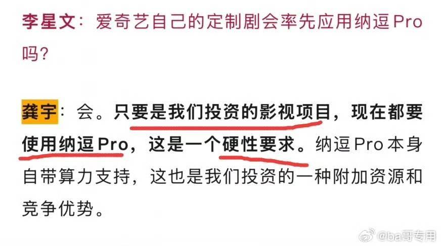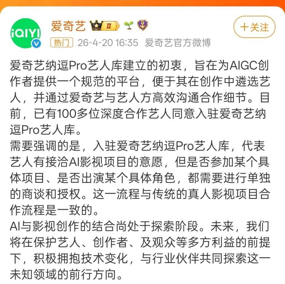 在回应中,爱奇艺特别强调:“入驻爱奇艺纳逗Pro艺人库,代表艺人有接洽 AI影视项目的意愿,但是否参加某个具体项目、是否出演某个具体角色,都需要进行单独的商谈和授权。这一流程与传统的真人影视项目合作流程是一致的。”