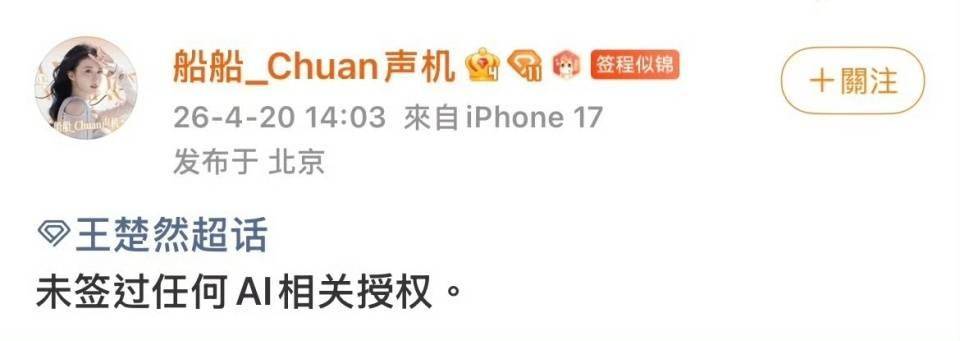 王楚然官方后援会账号“船船_Chuan声机”也发布信息:“未签过任何AI相关授权。”李一桐团队同样确认:“未签署任何影视AI授权。”