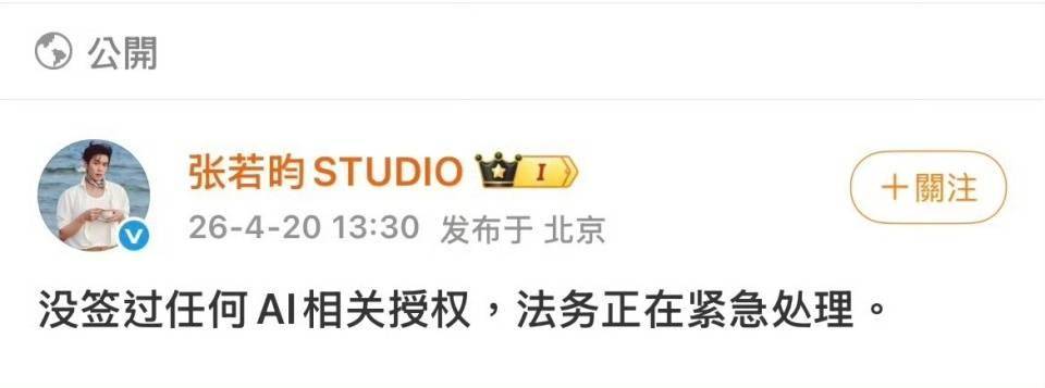 首先是4月20日13时30分,张若昀工作室率先发声:“没签过任何AI相关授权,法务正在紧急处理。”语气之严厉,措辞之果断,足见事件的严重性。