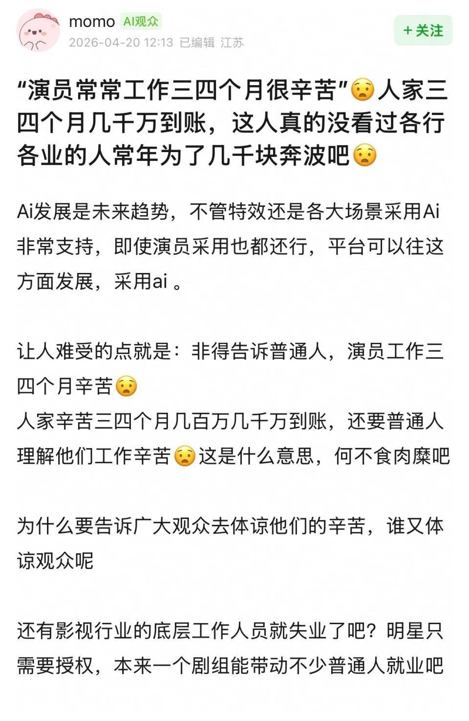 “一年工作三、四个月很辛苦吗?我们打工人一年到头连轴转,连个完整的周末都没有!”“不拍戏不就失业了吗?AI代替演员,那演员以后干什么?”
