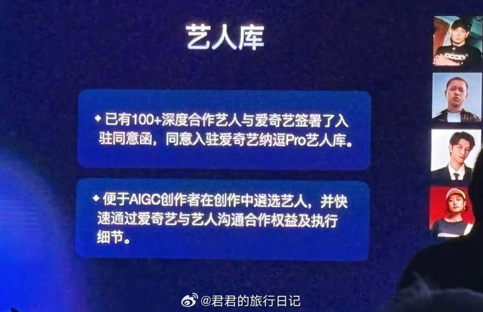 CEO龚宇表示宣布全面推行“AI艺人库”,随后,爱奇艺高级副总裁刘文峰透露,张若昀、王楚然、马苏、成泰燊、陈哲远、曾舜晞、丞磊、房主任、蒋龙等百位艺人已签约入驻爱奇艺专业级影视制作平台“ 纳逗Pro”的艺人库,标志着平台正在将AI深度融入影视创作。