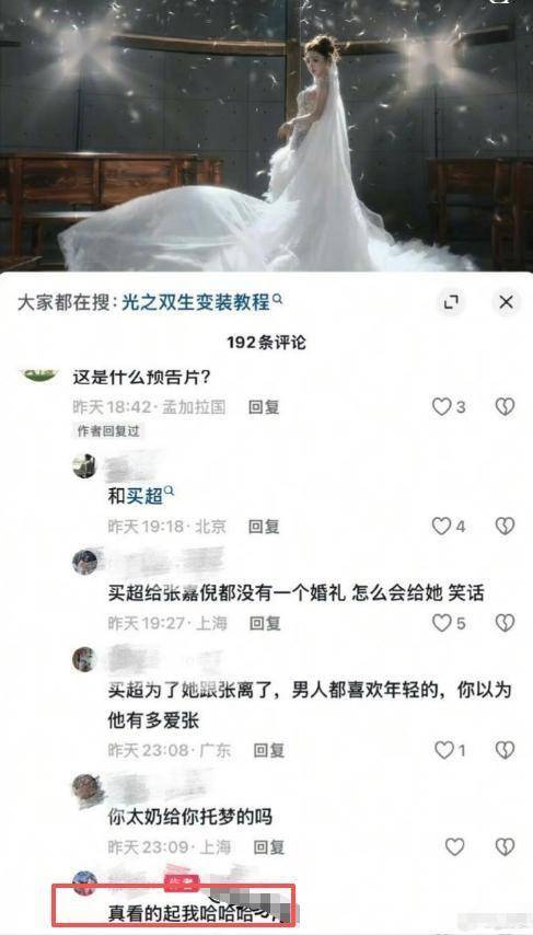 2026年初,啵姐发布个人动态称“我要结婚了”,网友再次跟风联想,留言质疑买超为了你和张嘉倪离婚。
