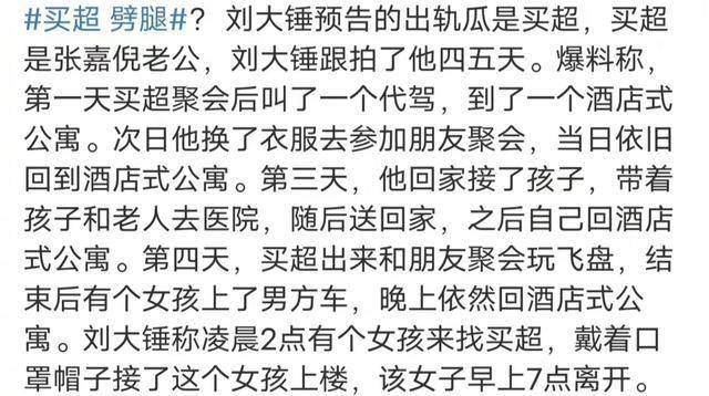 在张嘉倪二胎哺乳期,买超还传出了出轨的消息,流连风月场所,与陌生女子深夜同入酒店,长达数小时不归宿。