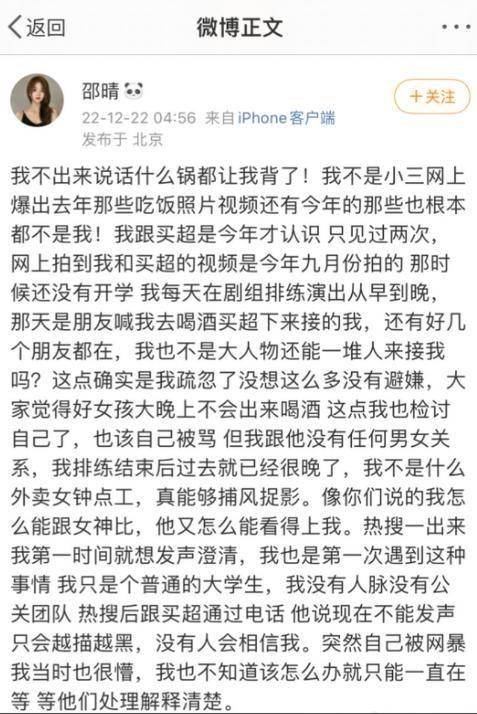 丑闻发酵初期,邵晴第一时间发文否认,声称自己和买超仅见过两三次,只是普通朋友,绝非插足他人婚姻的第三者,甚至晒出个人声明,极力撇清关系。