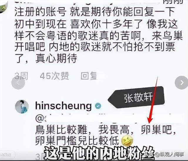 有一位喜欢他十多年的内地粉丝,在社交平台恳切留言,说自己从初中就喜欢他,不会粤语的歌迷追他很辛苦,希望他能去鸟巢开唱。