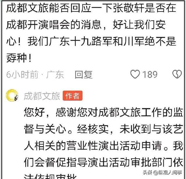 其回应称:“您好,感谢您对成都文旅工作的监督与关心。经核实,未收到与该艺人相关的营业性演出活动申请。我们会督促指导演出活动审批部门依法依规审批。”