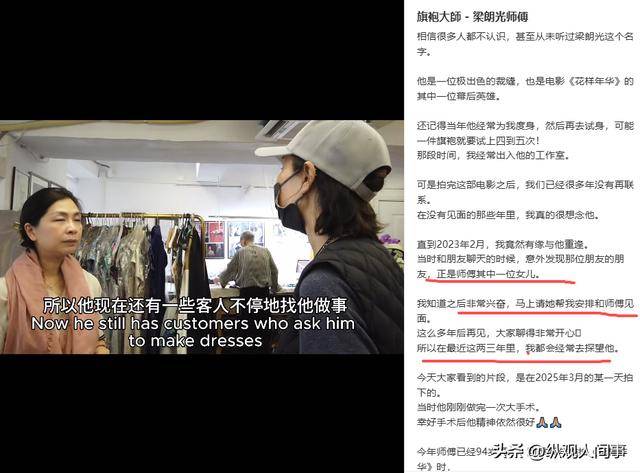 还有一段她与旗袍大师梁朗光同框的视频,她得知老人还在世后,这两三年一直来探望,这个情谊也非常令人感动。