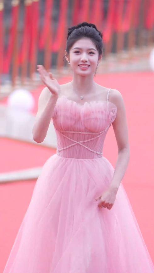 到了晚会环节,她又换了一身粉色珠光抹胸礼服,依旧是盘发造型。