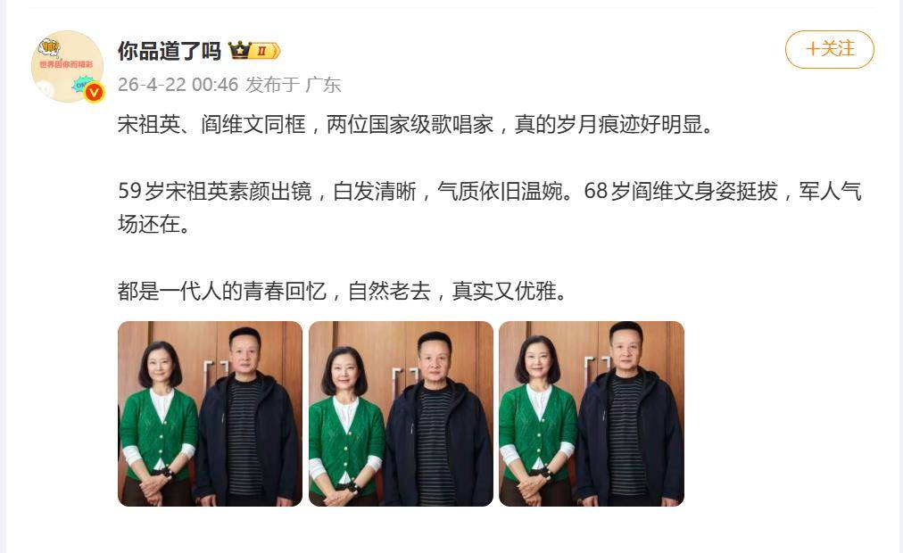 照片中显示,现年59岁的宋祖英身穿绿色针织衫与黑色休闲裤,打扮低调朴素。她未施任何粉黛,脸上细纹与自然老去的痕迹清晰可见,甚至能看见些许白发。然而,正是这份毫无修饰的“真实感”,结合她挺拔的身姿与温婉的笑容,反而凸显出一种经过时光洗礼后的沉静魅力。与她合影的男友人,被网友认出是同样知名的歌唱家阎维文。