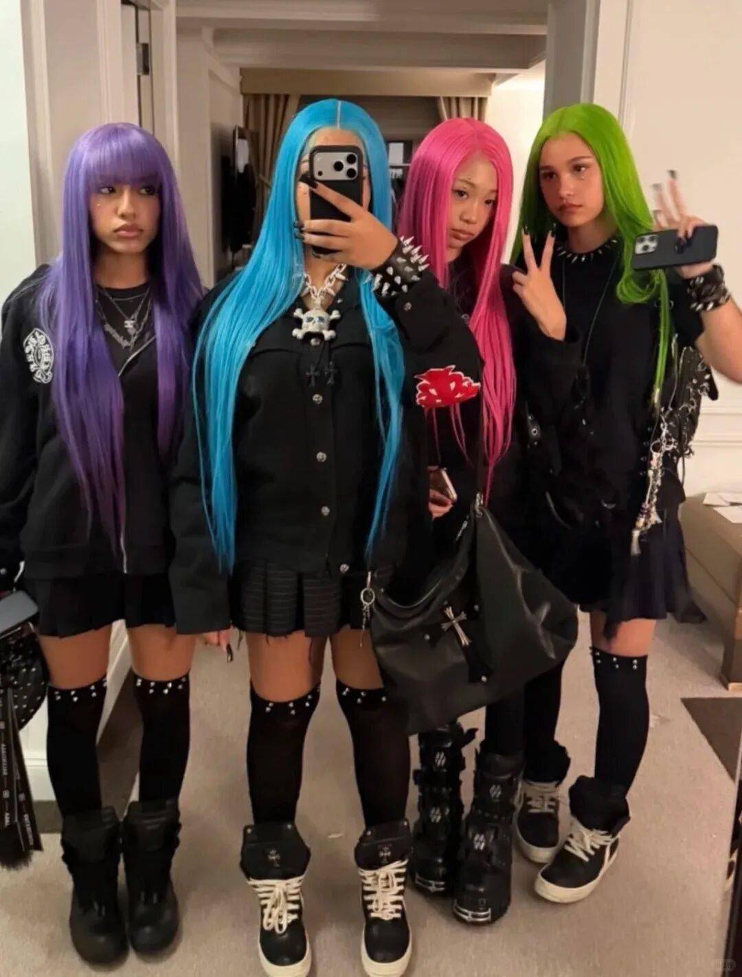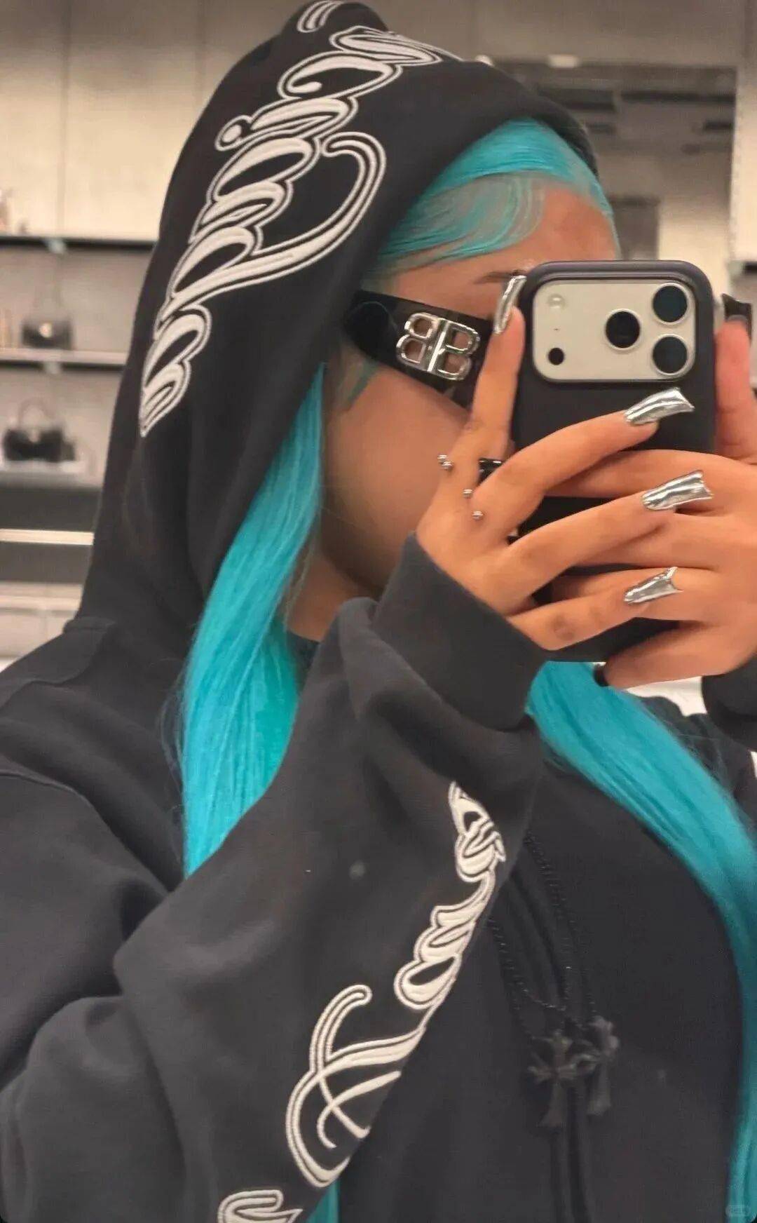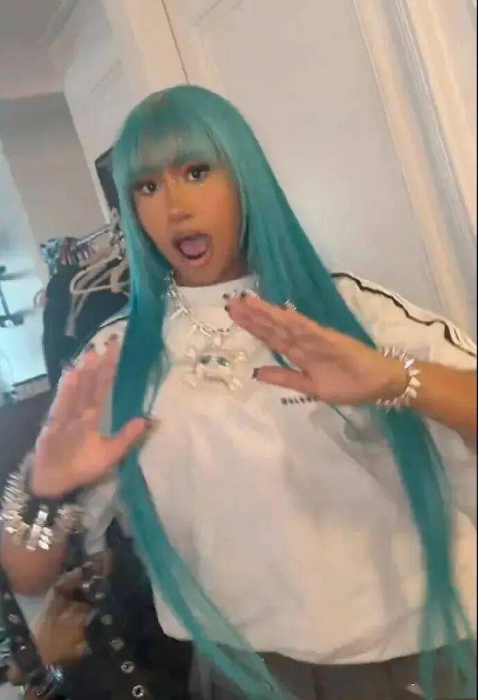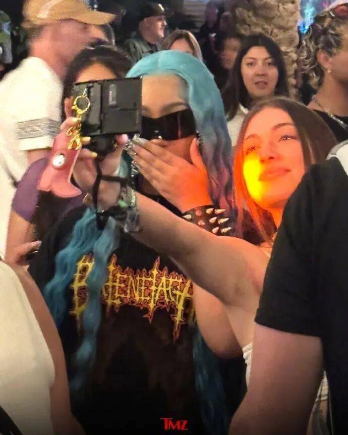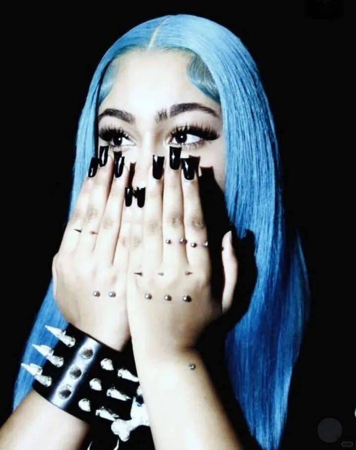 顶着一头蓝色假发,脸戴超大墨镜,搭配上酷酷的表情,还挺有范儿。