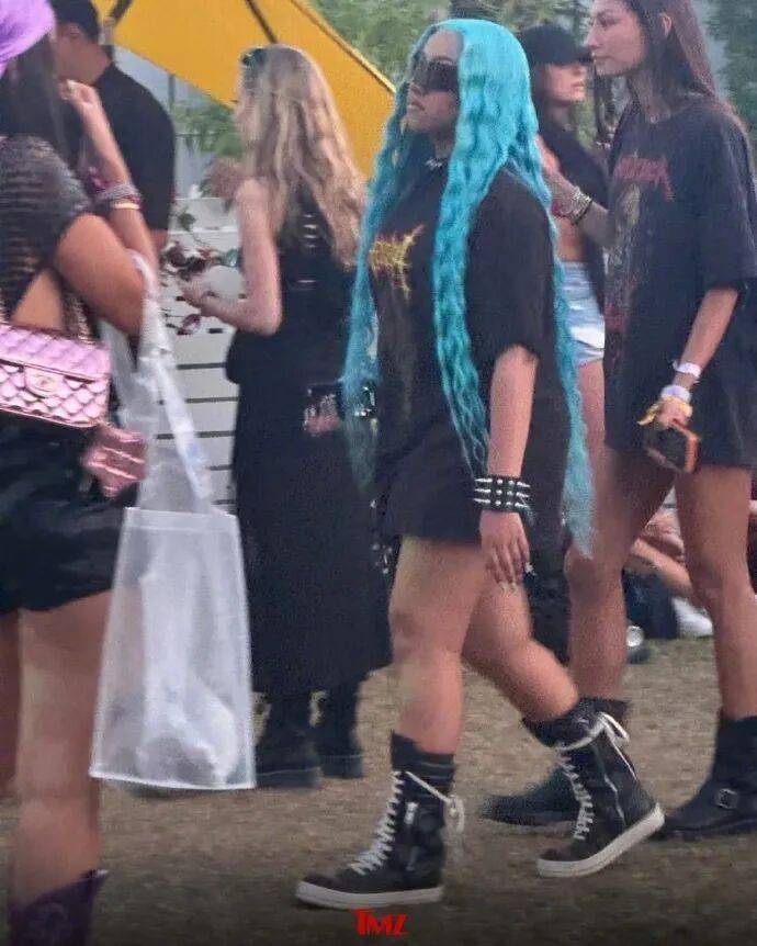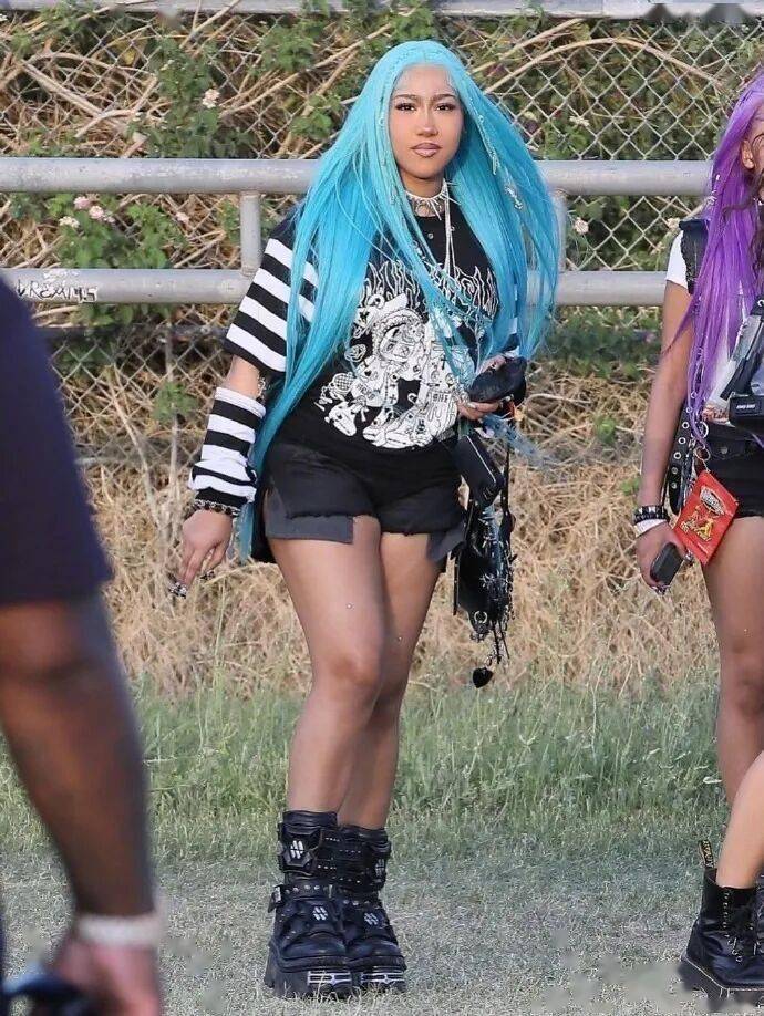 一眨眼,小西北都长这么大了?!最近,侃爷和卡戴珊的女儿——小西北(North west)和朋友一起亮相科切拉音乐节。顶着一头蓝色假发,脸戴超大墨镜,搭配上酷酷的表情,还挺有范儿