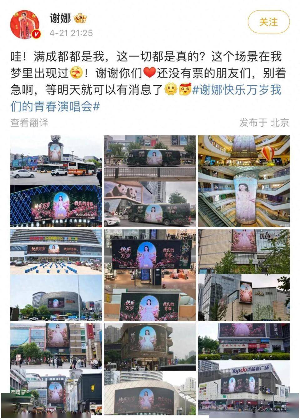 4月21日晚,娱乐圈知名女主持人谢娜在北京发了一条动态。配图是九张照片,里面是成都街头的粉丝应援。按照谢娜本人的说法,就是满成都都是自己,这一切好像不是真的。这样的场景只