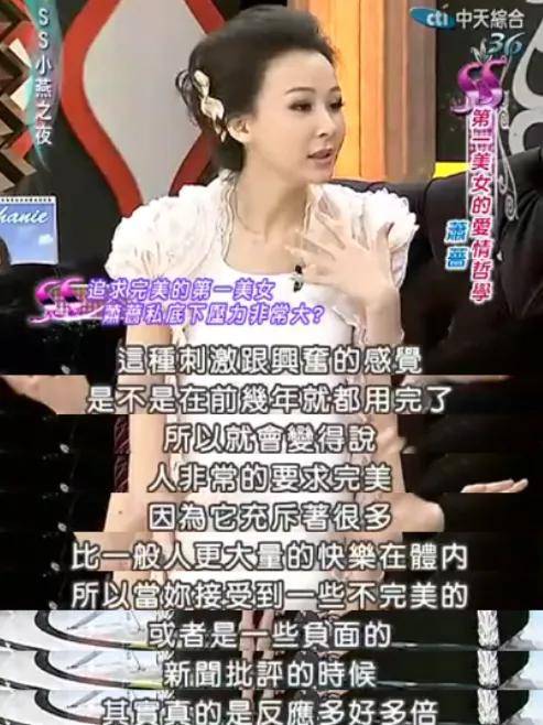 很巧的是,她在讲那一段关于这些绝色美女境遇的感悟时,台湾著名制作人王伟忠就坐在她旁边,当时他看着她还是很年轻、很漂亮的容颜,眼中有欣赏。