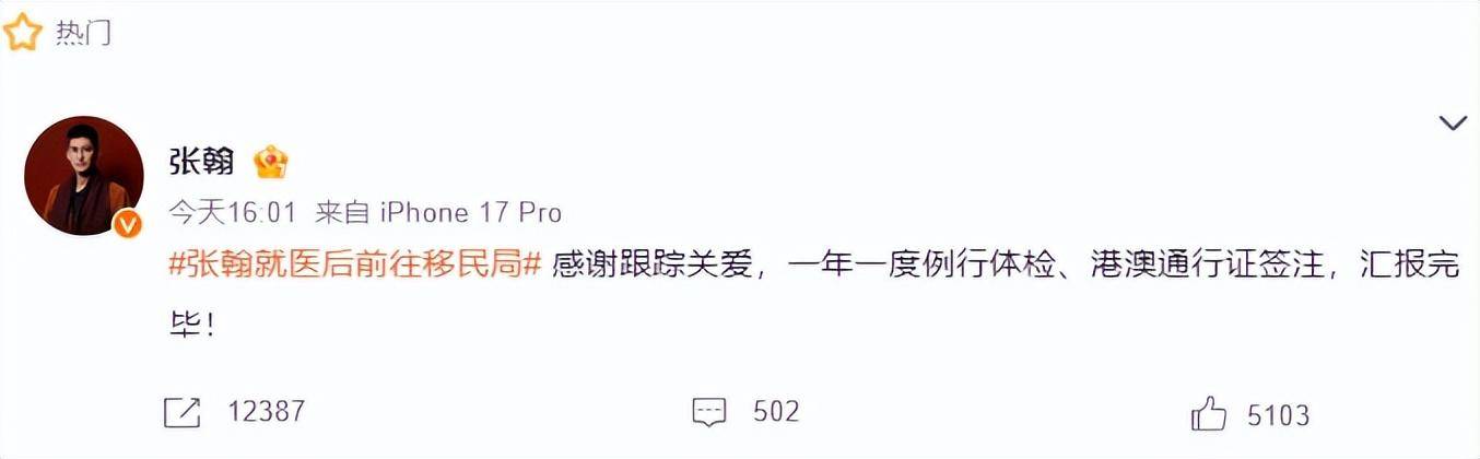 他在社交平台发文,语气带着几分无奈,也带着几分调侃:“感谢跟踪关爱,一年一度例行体检、港澳通行证签注,汇报完毕!”